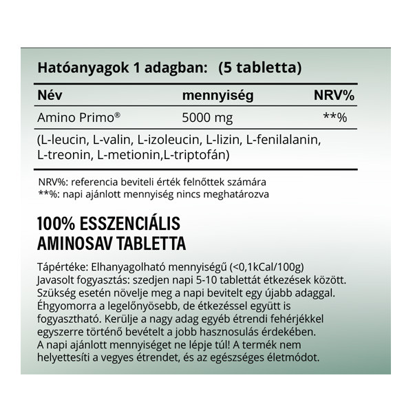 Az Amino Primo esszenciális aminosav tabletta ideális arányban tartalmazza a felnőtt szervezet igényét a nyolc fehérje építő aminosavból. Ezek a fenilalanin, izoleucin, leucin, lizin, metionin, treonin, triptofán és a valin.