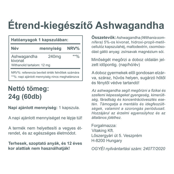 Az Ashwagandha az Ayurveda ( ősi indiai orvoslás, "az élet tudománya") egyik legfontosabb gyógynövénye. A termék kapszulánként 240mg ashwagandha kivonatot tartalmaz (withanolid tartalom 12mg)