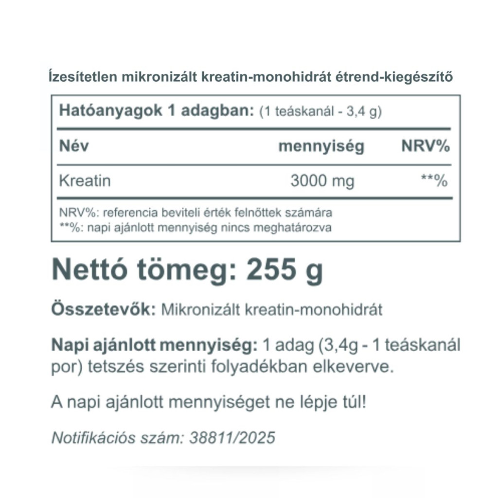 Ez a kedvező hatás 3 g kreatin napi bevitelével érhető el. Por formában igen gazdaságos választás, ugyanis 1 teáskanálnyi adag 3,4 g-ot tartalmaz.