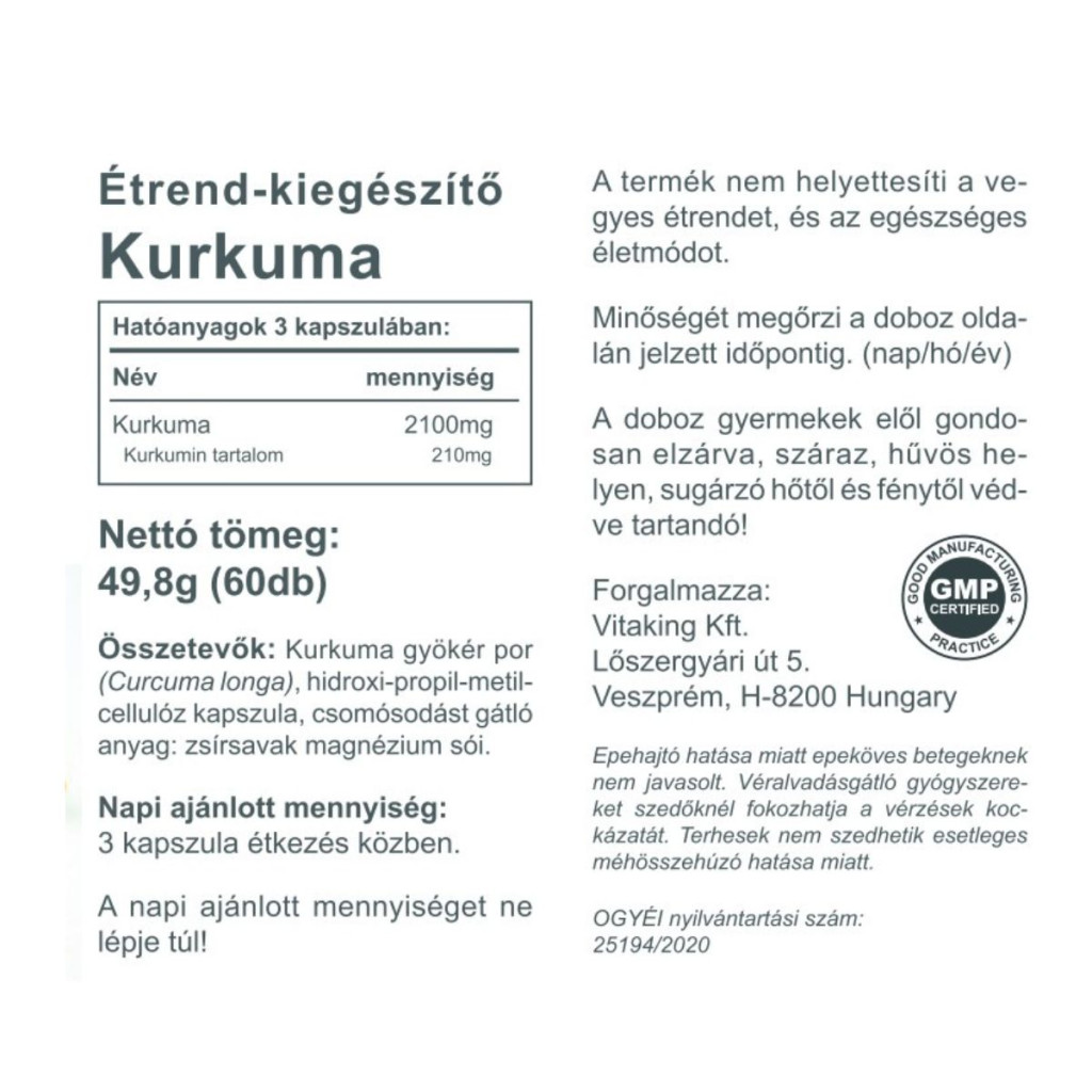 Összetevők : Kurkuma gyökér por (Curcuma longa), hidroxi-propil-metil-cellulóz kapszula, csomósodást gátló anyag: zsírsavak magnézium sói.